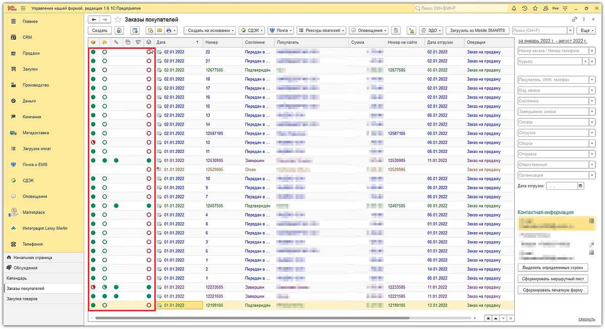 Все заказы попадают в базу 1С, независимо от того, где они были оформлены – на маркетплейсе или в интернет-магазине. Сотрудник «Удачного Сезона» получает их в виде списка в одном окне. Он передаёт заказы на склад для сборки, а статус каждого из них отслеживает с помощью цветовых индикаторов на всех этапах. Зеленый цвет в учётной системе означает, что заказ собран на складе, упакован и передан в доставку.