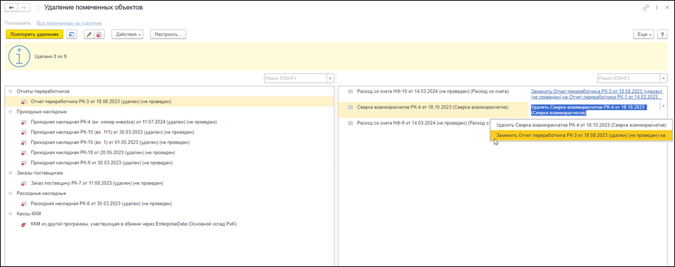 Иногда система не может удалить объекты из-за того, что на них ссылаются другие документы, справочники, файлы и т.д. В этом случае справа отобразится окно с ссылками на удаляемые объекты. Их можно пометить для удаления, если вы уверены, что данные объекты действительно не нужны или заменить (например, номенклатуру в заказе покупателя).