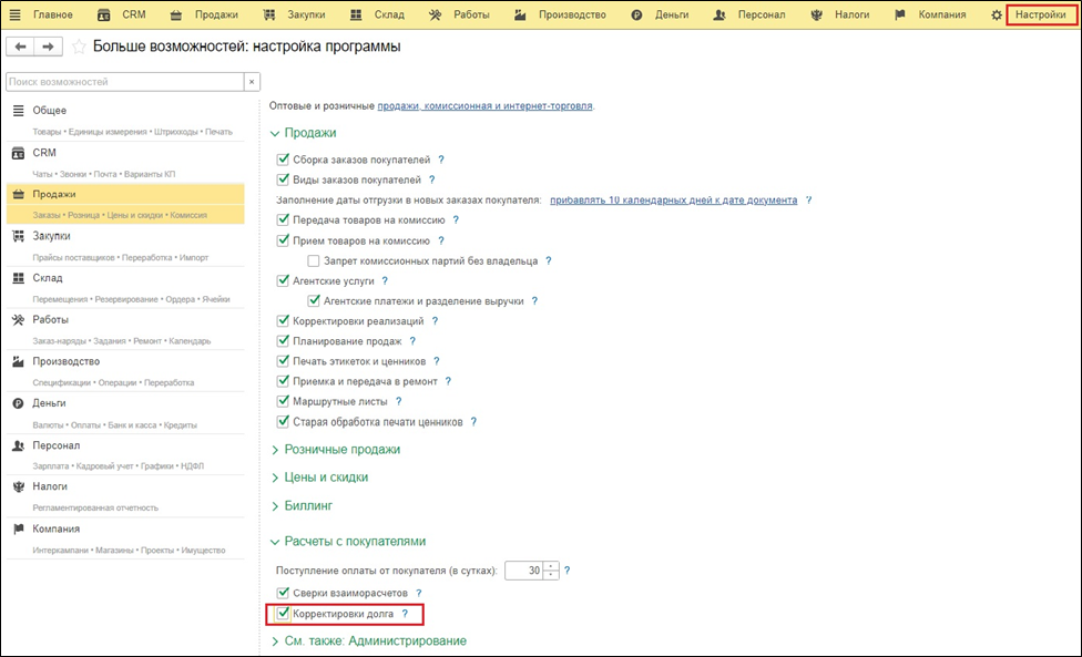 Для начала необходимо проверить, что в настройках включена данная опция. Заходим в «Настройки», →«Продажи», → «Расчеты с покупателями» → «Корректировки долга», ставим галочку в чекбоксе.