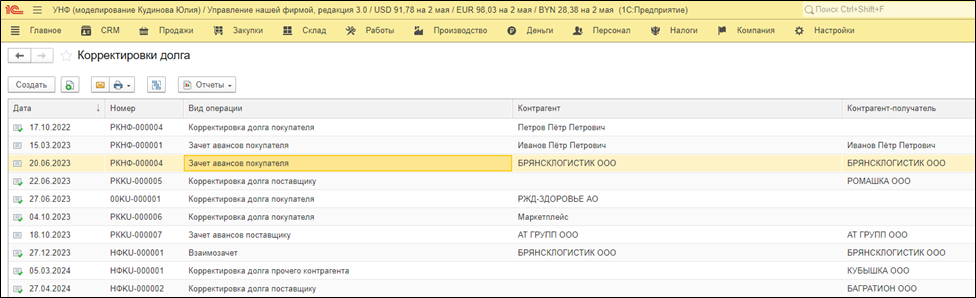 После включения настройки нам необходимо зайти в раздел «Продажи» → «Корректировки долга». В данном разделе будут отображаться все записи по тем контрагентам, с которыми проводились корректировки по долгам.