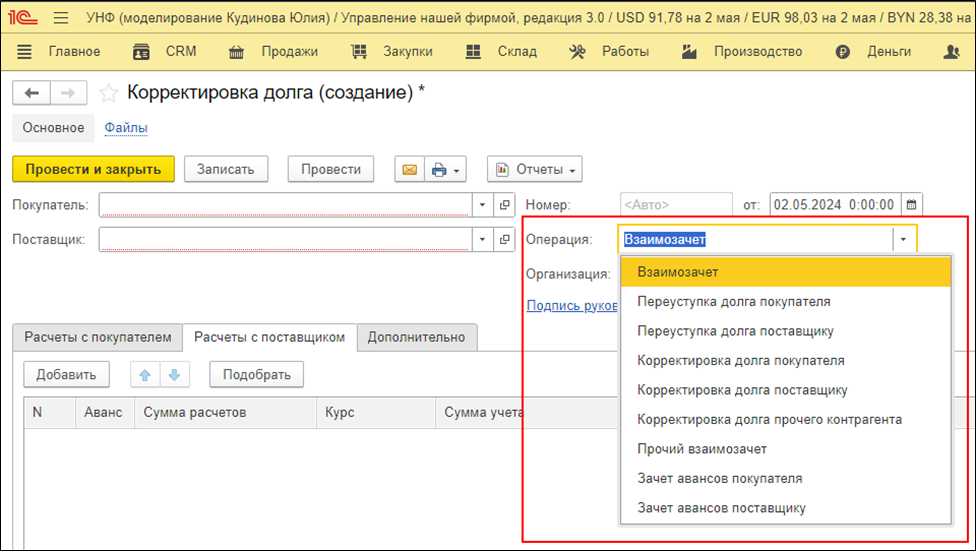 Прочий взаимозачет. Эта операция необходима для отражения корректировок по документам, в которых участвует контрагент с типом «Прочие». Эти контрагенты не являются покупателями или поставщиками, например, банк, налоговая, таможня. В данном виде операции предлагается заполнить корреспонденцию прямо в документе. В остальном, принципиальной разницы между типами операций «Взаиморасчет» и «Прочий взаиморасчет» нет.