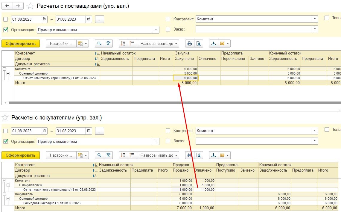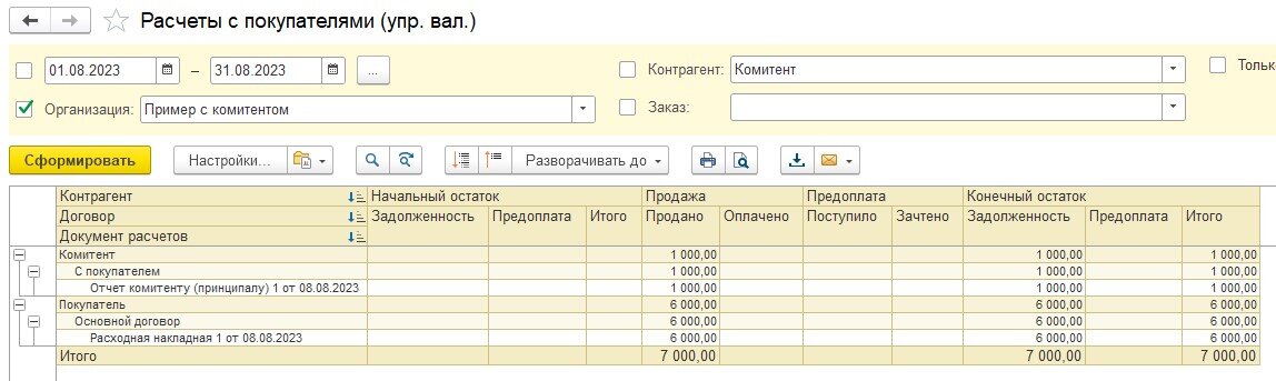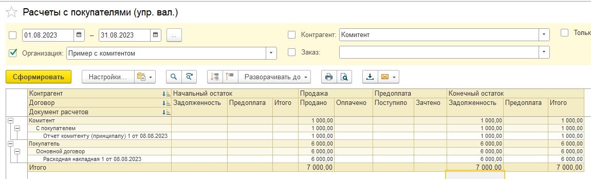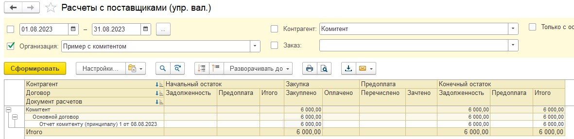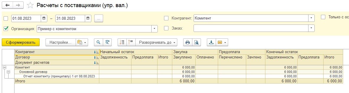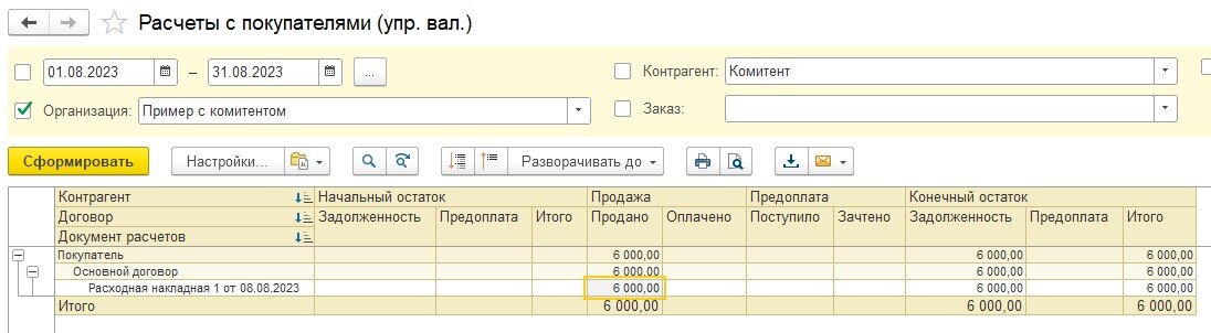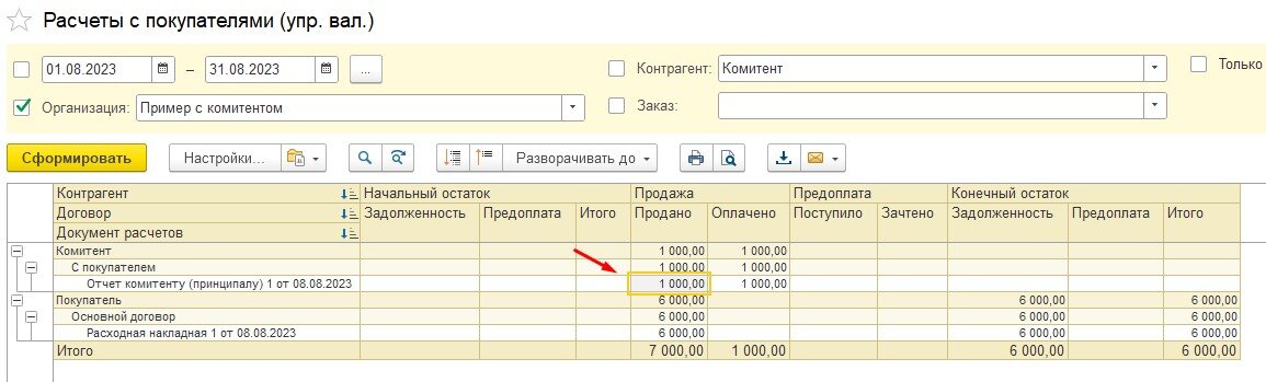 3) Сделали отчет комитенту. Указали цену 6000 рублей, цену поступления 5000 рублей и сумму комиссии 1000 рублей