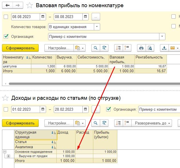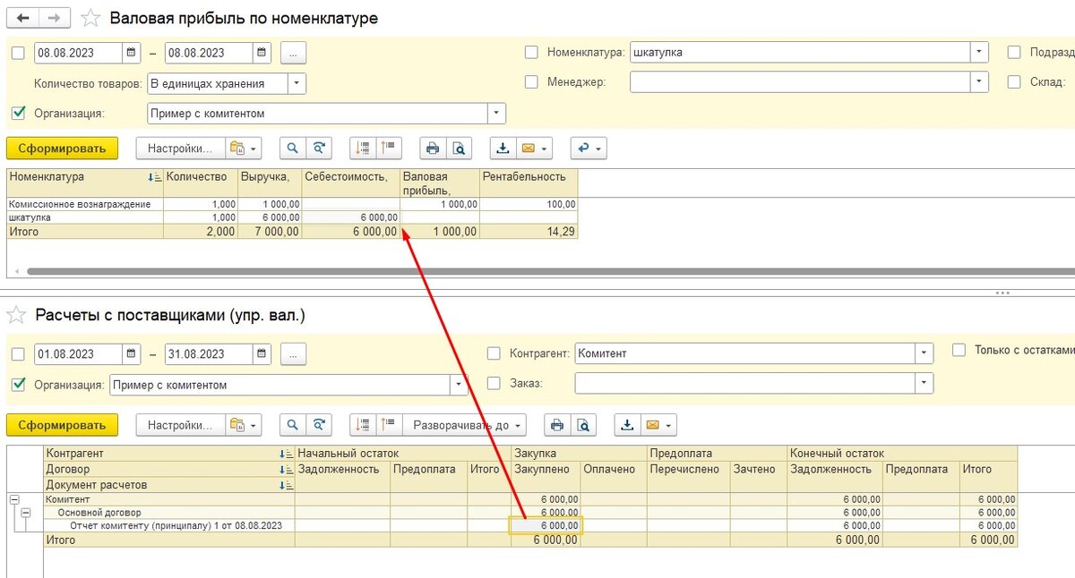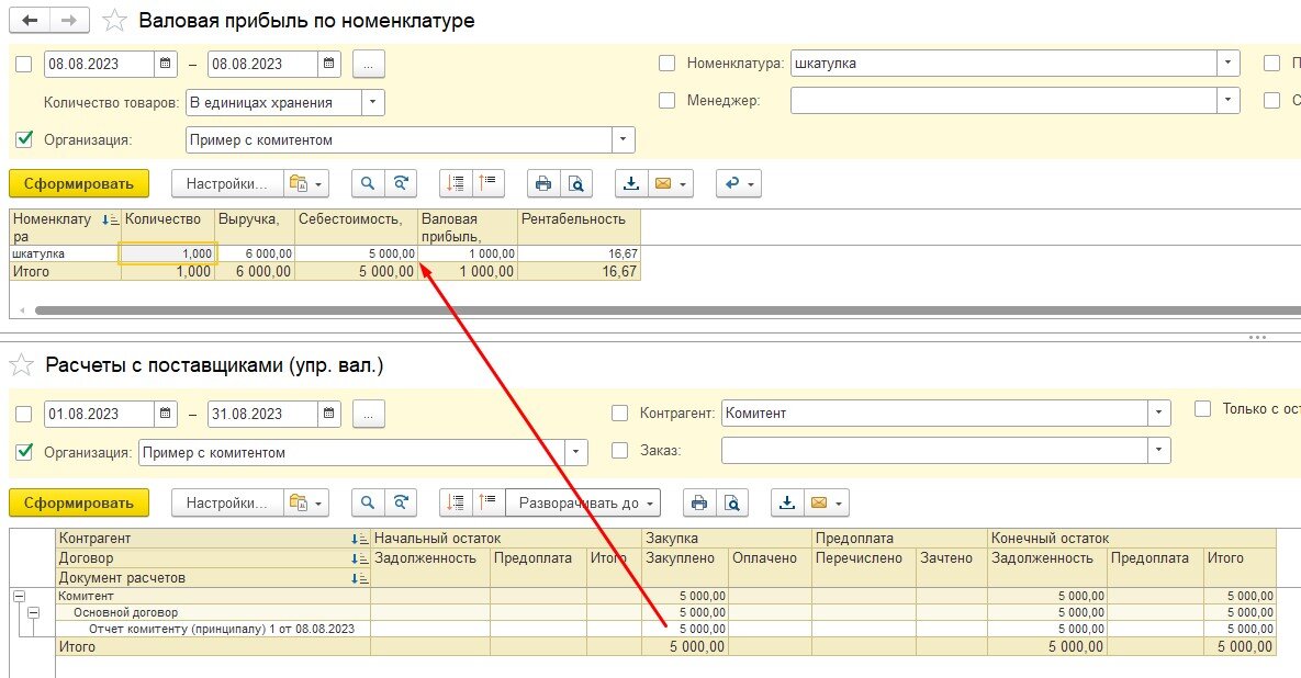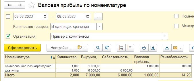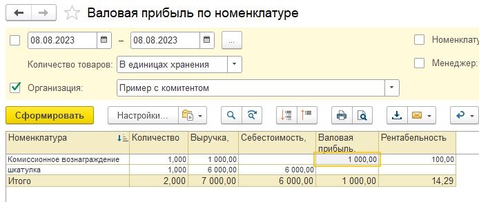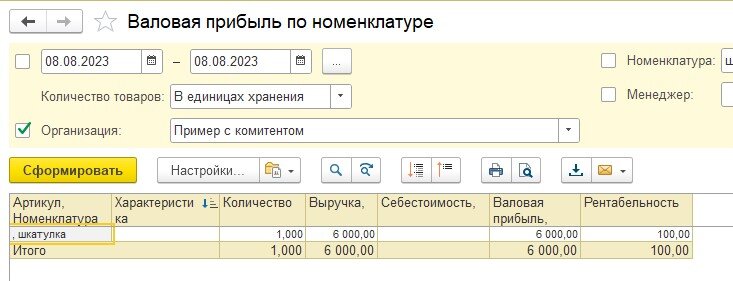 В отчете «Валовая прибыль» видим Выручку на сумму 6000 рублей по проданной конечному покупателю номенклатуре без себестоимости (себестоимость появится, когда оформим отчет комитенту)