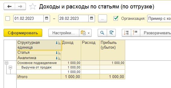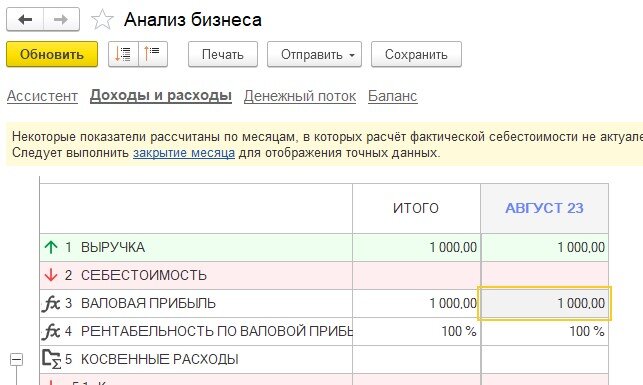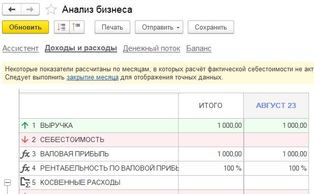 В Доходах и расходах, а также в Анализе бизнеса мы увидим сразу сумму 1000 рублей дохода без себестоимости продаж (без изменения по сравнению с прошлой схемой).